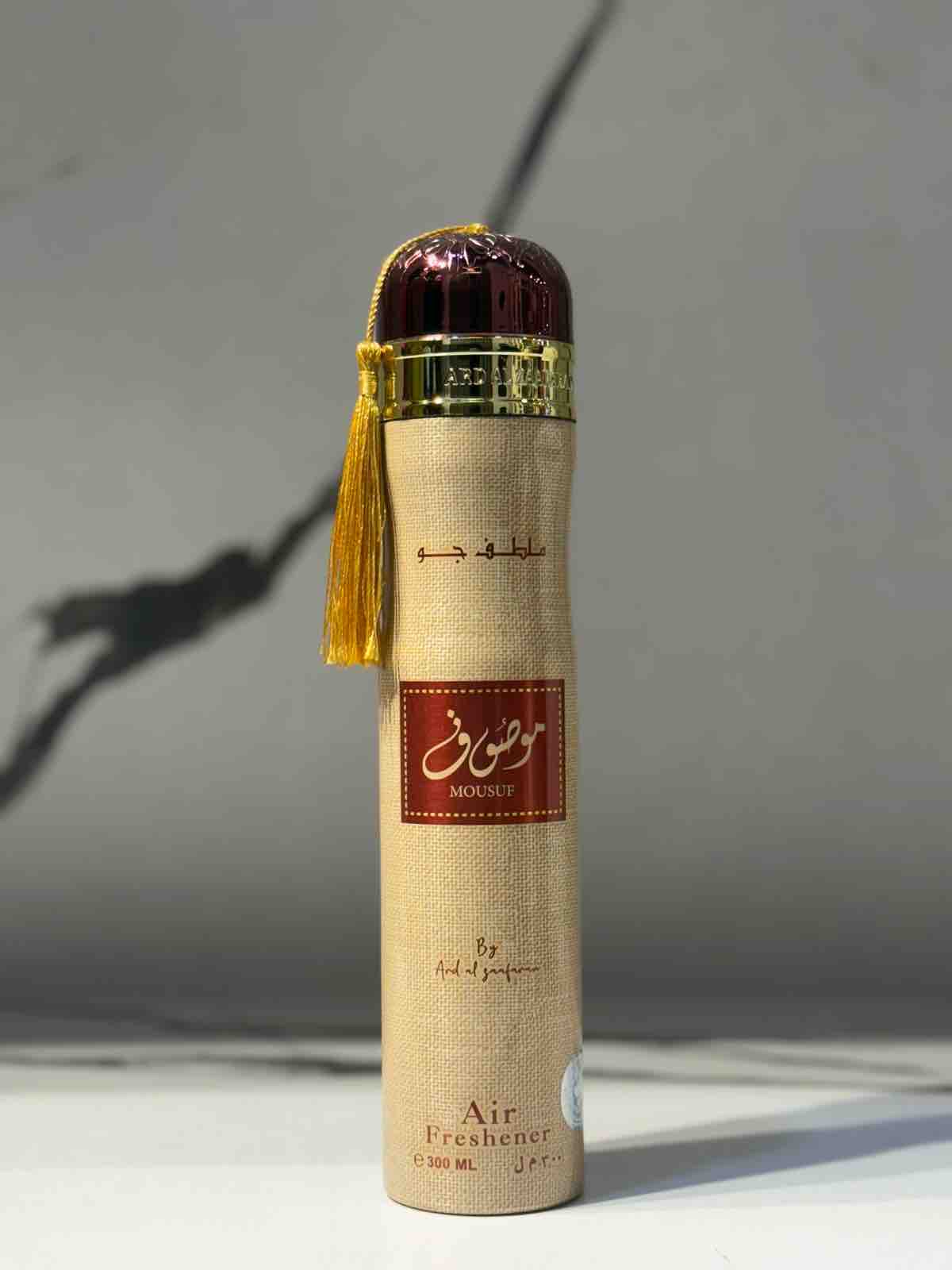 This is Mousuf Air Freshener (300ml) by Ard Al Zaafaran — beautifully presented in an elegant beige-textured canister with gold accents and a matching tassel. It delivers a warm, inviting oriental scent that refreshes your space with a cozy, luxurious touch of traditional Arabic fragrance.