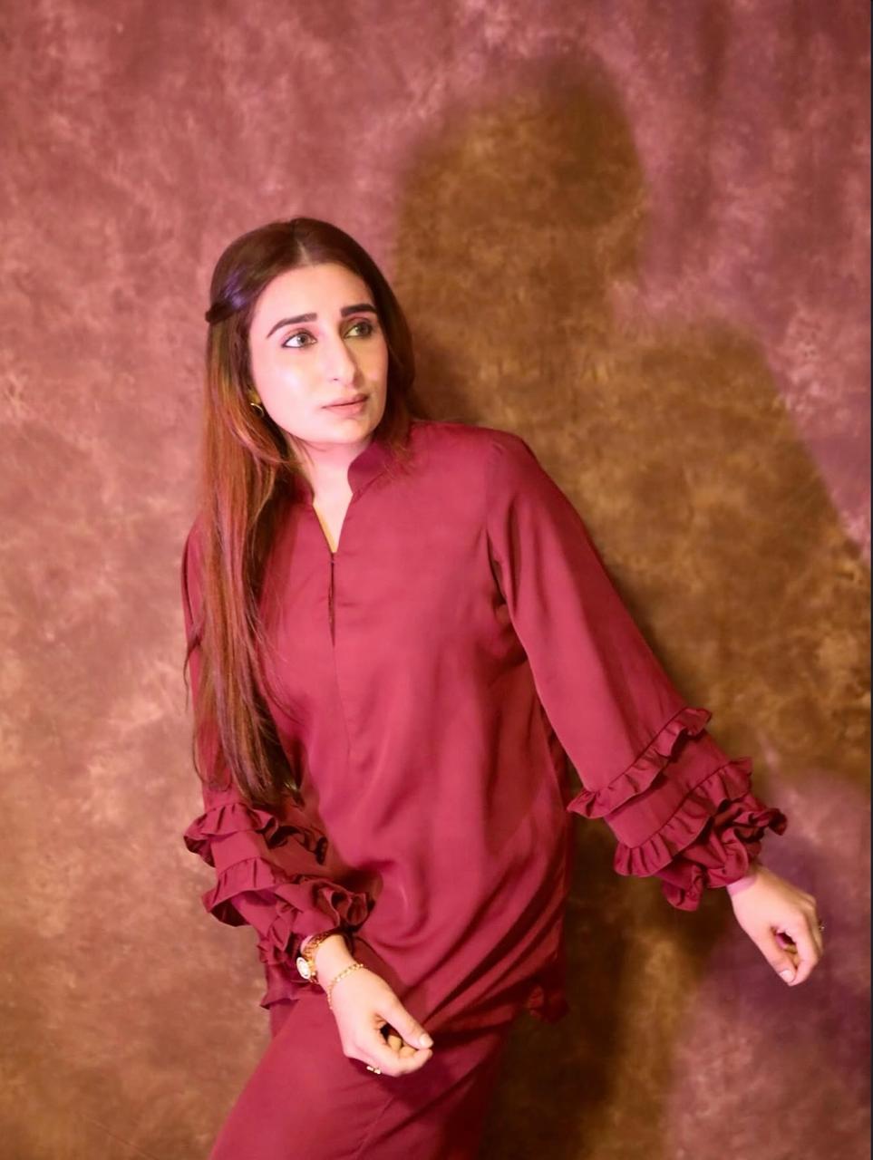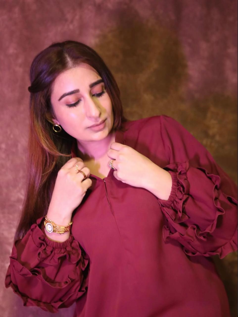 A chic cordset designed with a flowy long top and straight pants, featuring layered ruffle sleeves for a touch of elegance. Perfectly crafted in rich hues, it blends comfort with modern sophistication – ideal for both casual and semi-formal wear.”