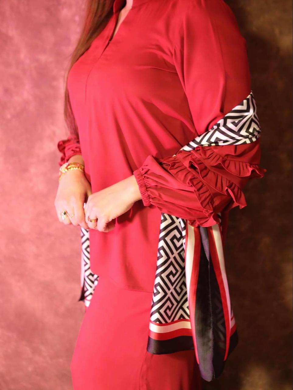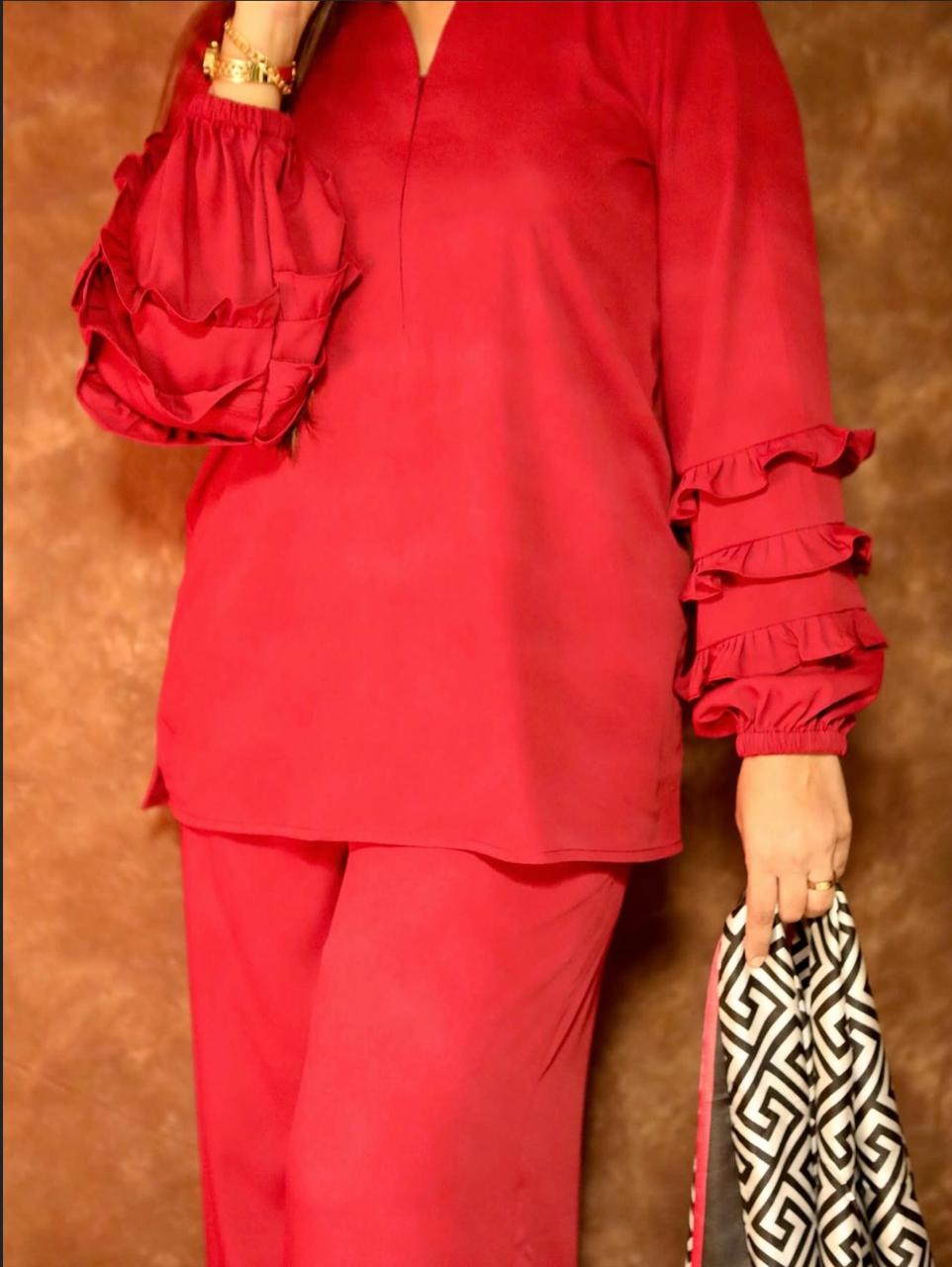 A chic cordset designed with a flowy long top and straight pants, featuring layered ruffle sleeves for a touch of elegance. Perfectly crafted in rich hues, it blends comfort with modern sophistication – ideal for both casual and semi-formal wear.”