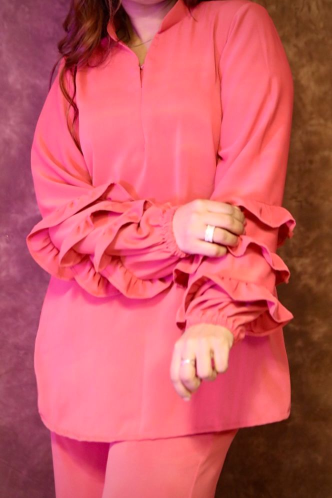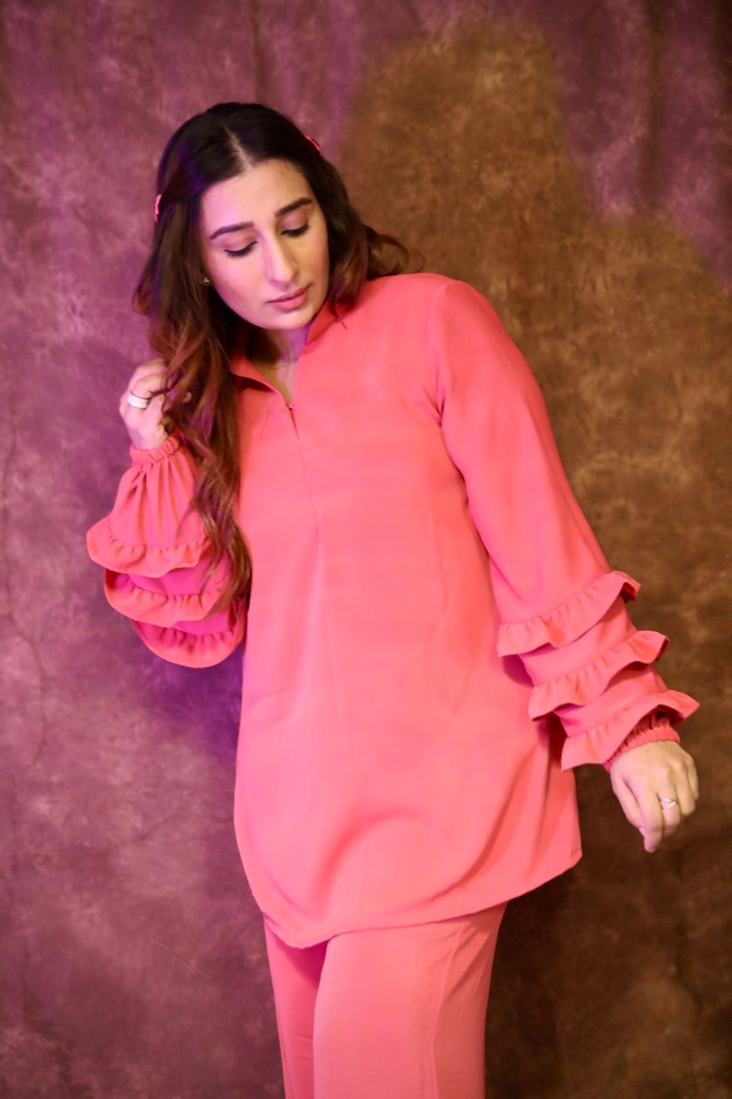 A chic cordset designed with a flowy long top and straight pants, featuring layered ruffle sleeves for a touch of elegance. Perfectly crafted in rich hues, it blends comfort with modern sophistication – ideal for both casual and semi-formal wear.”
